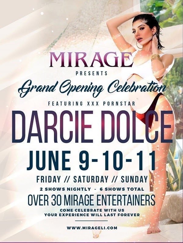 Darcie Dolce will be performing 2 shows nightly. Between shows she will be mingling with the guests, taking photos and doing lap dances. “I can’t wait to rock the stage at Mirage Gentlemen’s Club and party with my fans!” says Darcie Dolce. These shows will definitely be standing room only - so make sure to get there early.