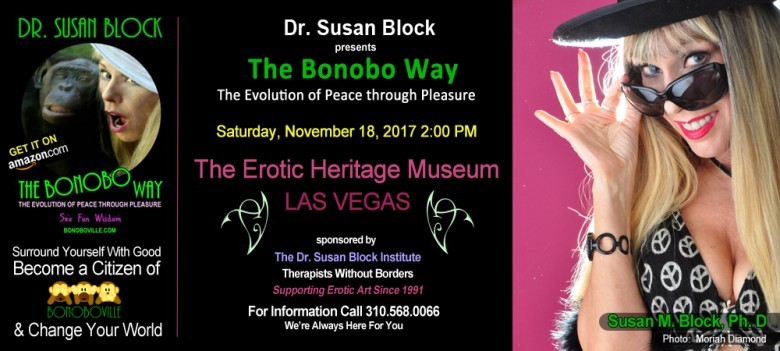 For Immediate Release: Nov. 1, 2017 — Susan M. Block, Ph.D., a.k.a., “Dr. Suzy,” internationally renowned sexologist, best-selling author of The Bonobo Way: The Evolution of Peace through Pleasure (Gardner & DaughtersPublishers) and award-winning talk show host, perhaps best-known for her groundbreaking specials on HBO, will give a talk, “The Bonobo Way of Peace through Pleasure,”on Saturday afternoon, November 18th, 2:00 PM, in conjunction with the “Evolution of Human Sexuality” exhibit at the Erotic Heritage Museum in Las Vegas.