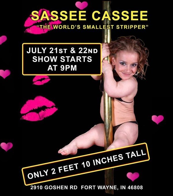 At Only 2'10" Little Sassee Cassee is the world's smallest midget stripper. Little Sassee Cassee has been featured on TV on The Jerry Springer Show, magazines and has performed all over the United States.