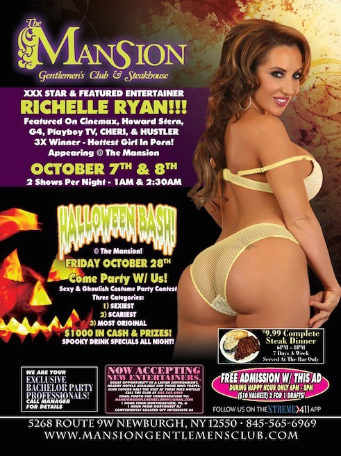 Richelle Ryan will be feature dancing at The Mansion Gentlemen’s Club in Newburgh, NY on Friday, October 7th and Saturday October 8th, 2016.