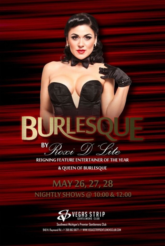 Showgirl Roxi D’Lite will be feature dancing at Vegas Strip Gentlemen’s Club in Battle Creek, MI on Thursday May 26th, Friday May 27th and Saturday May 28th, 2016.