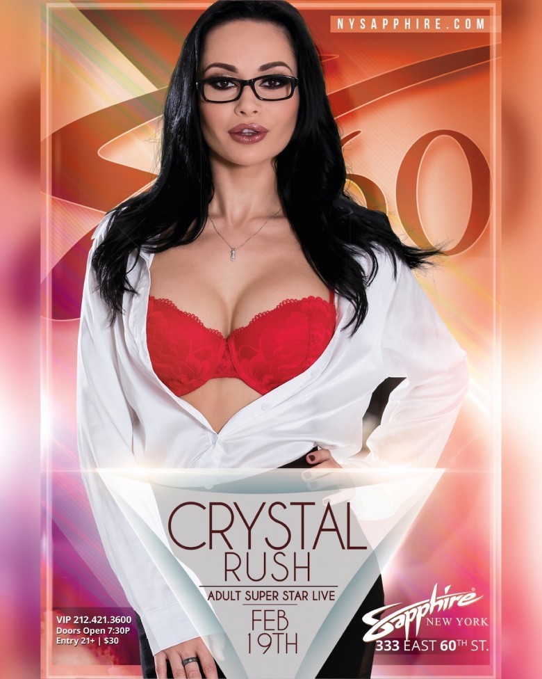 East Coasts fans of Crystal Rush have a lot to be excited about—she’s appearing this Saturday night for one night only at the infamous Sapphire 60 in NYC. In addition to a special live midnight show on the main stage, Crystal’s fans and club patrons will have a chance to meet the adult star, buy her merch, and/or snap a selfie with her during a meet and greet. Or they can go full tilt and purchase a VIP lap dance for the ultimate Crystal Rush experience.