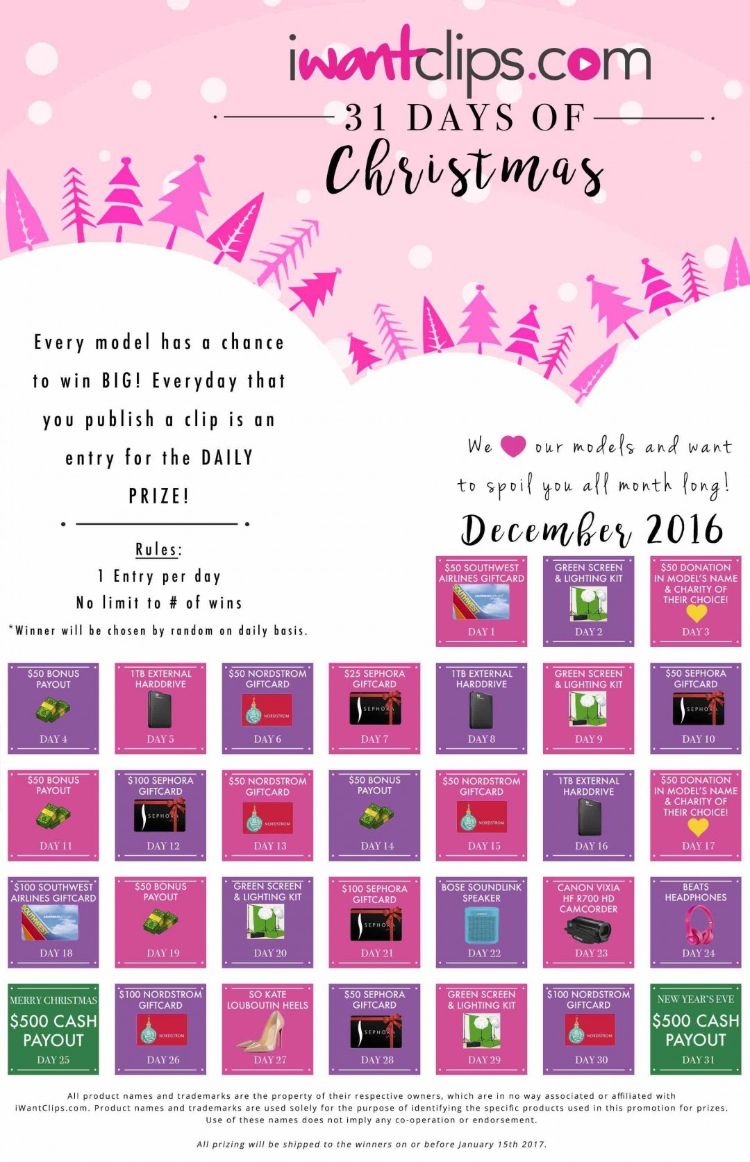 Models can enter once a day and every day of the month. One winner will be picked every day at random, based on daily uploads. There is no limit to the number of times you can win. Prizes that need to be shipped will be done so by or before January 15th.