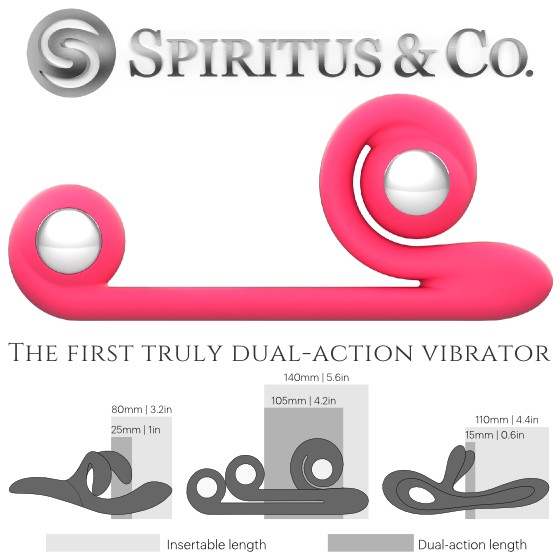 This is a completely new type of sex toy, designed from scratch to take pleasure in a novel direction. A Rabbit-style vibrator is limited to short thrusts during its dual-action, and stimulates only the middle part of the vagina. Spiritus for Her has the world’s longest dual-action length, making it equal to 420% and 700% of the length of two other popular sex toys. This unique feature allows the vibrator to stimulate the whole length of the vagina, from the entrance to the vault, using short or deep thrusts and any combination in between. The flexible arm allows the clitoral vibrator to sit comfortably over the clitoris and ensures constant contact during vaginal stimulation. Spiritus for Her is the first female pleasure toy to offer rotatory clitoral stimulation at the same time as vaginal thrusting.