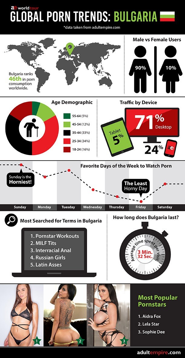Award-winning online adult retailer and entertainment destination Adult Empire (AE) recently surveyed the trends and fans’ viewing habits in the European country of Bulgaria in a new Global Porn Trends infographic.