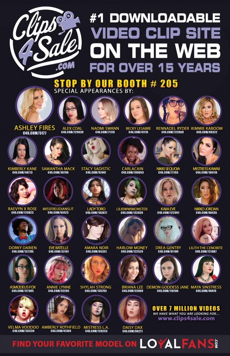 Get ready to meet your favorite Clips4Sale models and producers in Portland. Slated to appear at Clips4Sale booth is spokesmodel Ashley Fires, along with Mercy West, Mistress L.A., Daisy Dax, Alex Coal, Amara Noir, Amberly Rothfield, Annie Lynne, Asmodeus Fox, Becky LeSabre, Briana Lee, CarlaCain, Demon Goddess Jane, Dorky Darien, Drea Gentry, Eve Batelle, Harlow Money, Kaiia Eve, Kimberly Kane, Kimmie KaBoom, Lady Toro, Lilith the Cenobite, LilKiwwiMonster, Maya Sinstress, MissFreudianSlit, Mistress Kawaii, Naomi Swann, Nikki Sequoia, Nikko Jordan, Raevyn X Rose, Rennadel Ryder, Samantha Mack, Shylah Strong, Stacy Sadistic, Velma Voodoo, Molly, Cherry Bardot, Lyric Sky, and many more. Everyone signing will be giving away signed photos and there will be tons of Clips4Sale swag being handed out. Stop by Booth 205 often to see your favorite Clips4Sale stars and get your fill of the best swag at the show.