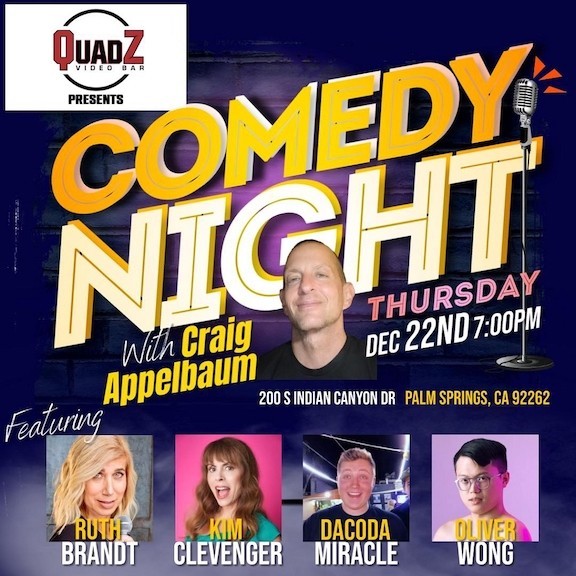 Don’t wait until Christmas to get a few ho-hos and ha-has in. This Thursday, December 22nd, Oliver Wong will be doing his stand-up at Comedy Night with Craig Applebaum at Quadz Video Bar in Palm Springs. Oliver will try out new material and deliver some of his classic comedy. The host, Craig Applebaum, and fellow comedians Ruth Brandt, Kim Clevenger, and Dacoda Miracle will join Oliver on stage. The laughs start at 7pm and will go on until late.