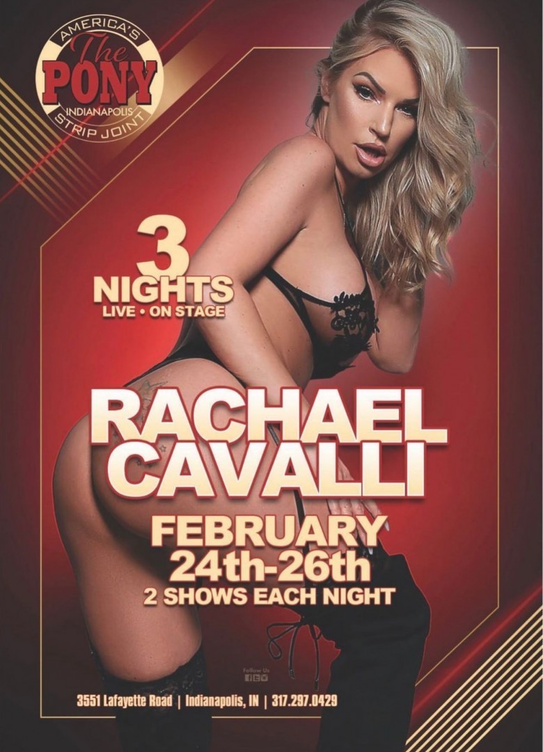 This Thursday, February 24th, through Saturday, February 26th, Rachael Cavalli is headed to the Midwest to feature at The Pony in Indianapolis. She’ll be hitting the main stage twice nightly and is ready to entertain her fans and club patrons with her colorful sexy outfits and dance moves. Rachael will also have multiple meet and greets, where she’ll be available for selfies and have her exclusive merch for sale. Go full tilt and get the full Rachael Cavalli experience with a VIP lap dance.