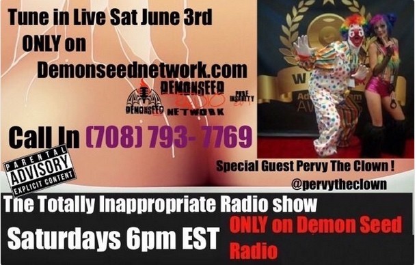 The Totally Inappropriate Radio Show airs this Saturday and every Saturday at 3pm PST/6pm EST on Demon Seed Radio Network. The two-hour show can be heard at http://www.demonseedradionetwork.com/ and call listeners can call in to talk to the hosts and/or guests at 708.793.7769.